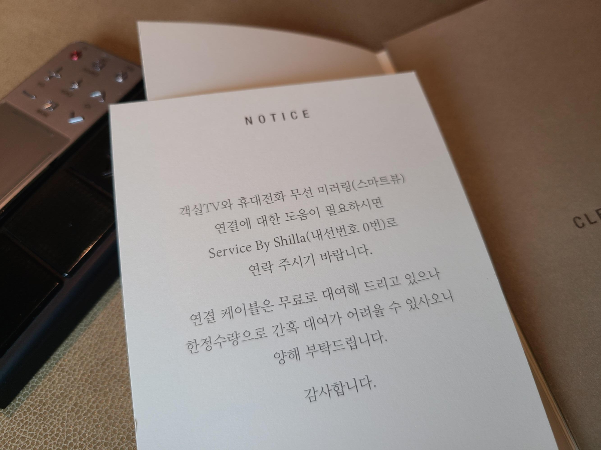 스마트폰과 TV를 미러링하려면 연결케이블이 필요한데요. 유튜브를 보거나 스마트폰과 TV연결이 필요하신 분은 체크인할 때 요청하시는걸 추천드려요. 케이블이 한정수량만 준비되어 있었고, 전부 대여중이어서 다음 날 체크아웃할때까지 연결케이블은 대여할 수 없었어요.