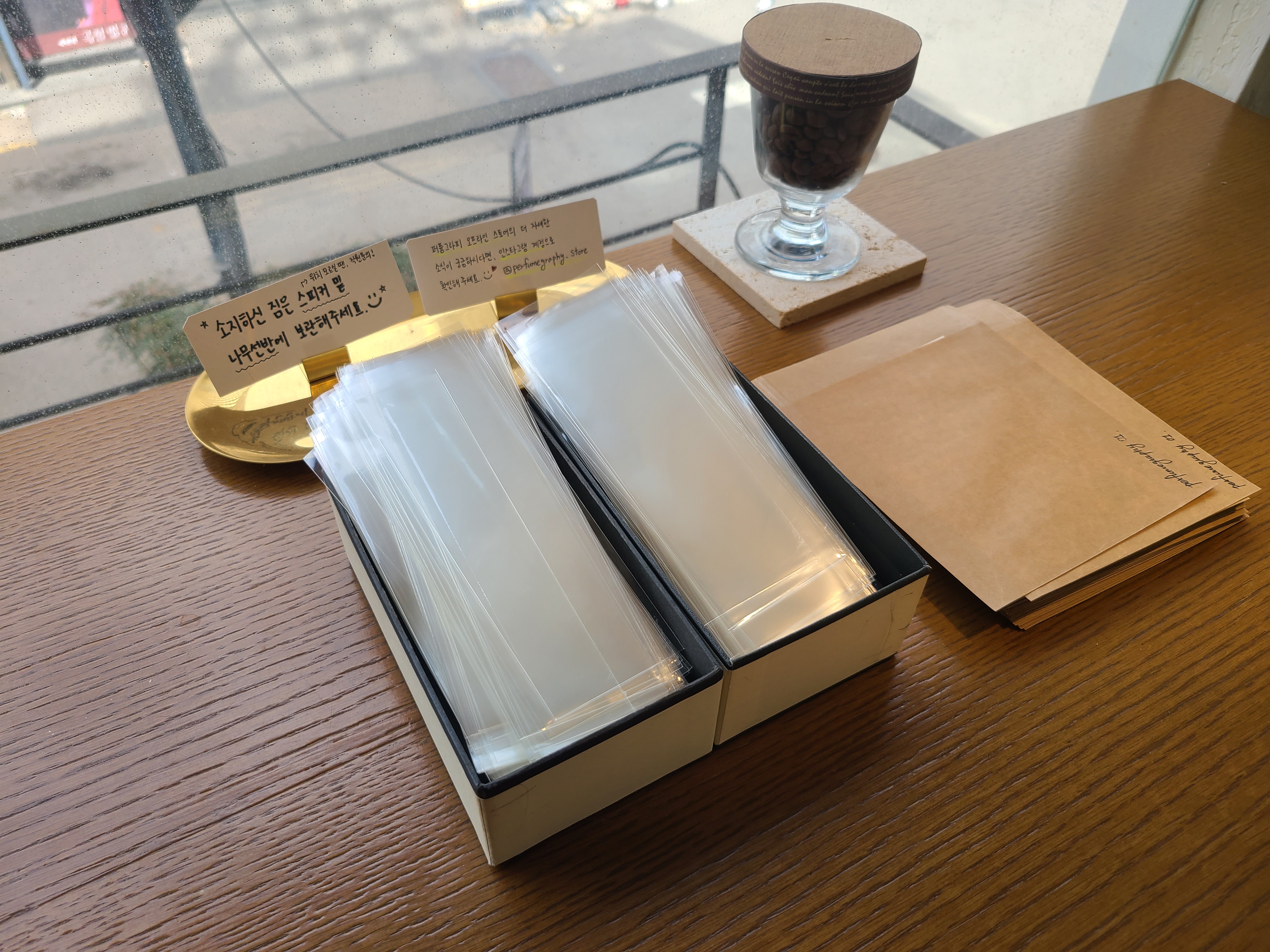 여기는 시향패킹존이에요. 향을 많이 맡아보시는 분들은 10개 이상도 맡아보시기 때문에 나중에 봉투에 담아서 들고 갈 수 있게 시향지 봉투가 비치되어 있었어요.