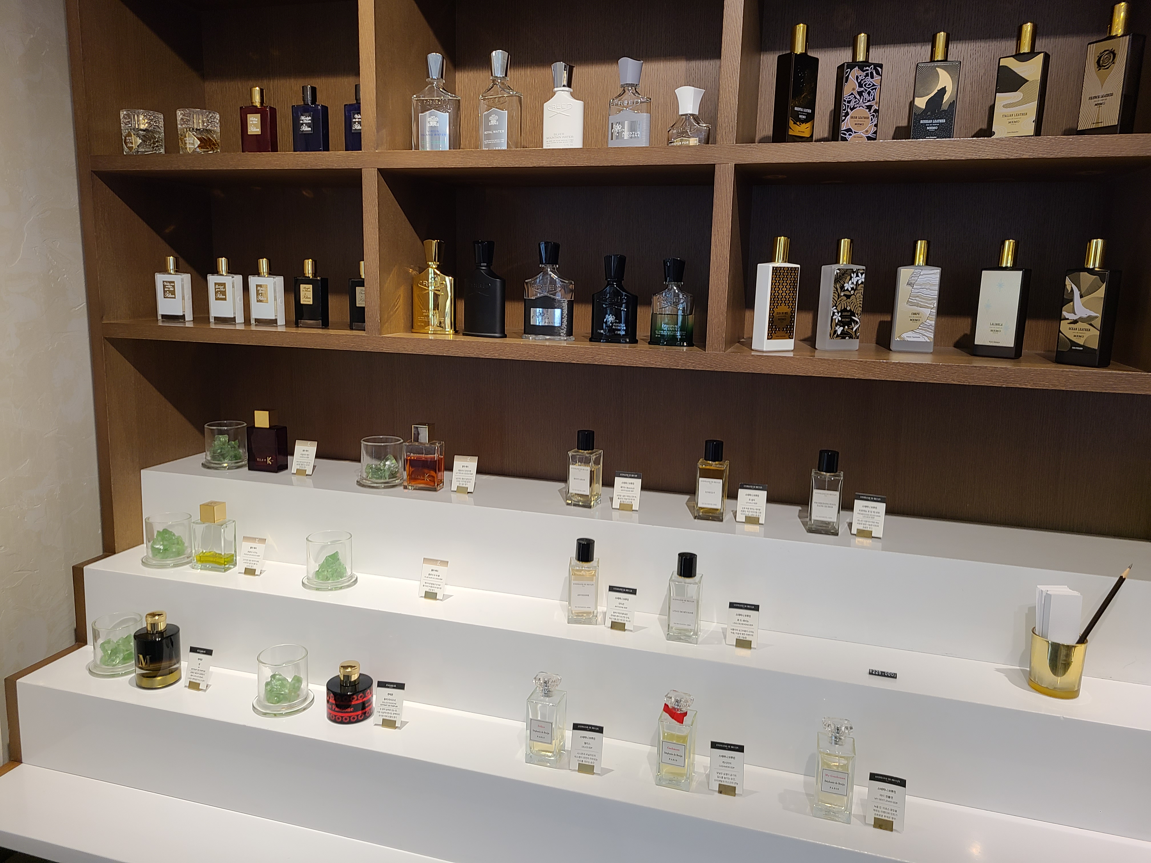 향수는 브랜드별로 비치되어 있었습니다. 제가 가장 궁금했던 크리드 향수들. 다양하게 진열되어 있었고 백화점처럼 직원의 안내에 따라 눈치보면서 시향하는 것이 아닌 편안하고 여유롭게 시향할 수 있어서 너무 좋았어요.